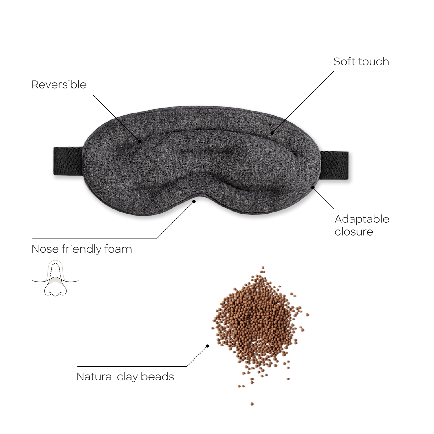 Its natural clay bead core applies a gentle pressure while fitting your face blocking out any light, and it’s specially designed to keep your nose free of pressure for an ultra-comfortable unwinding experience.