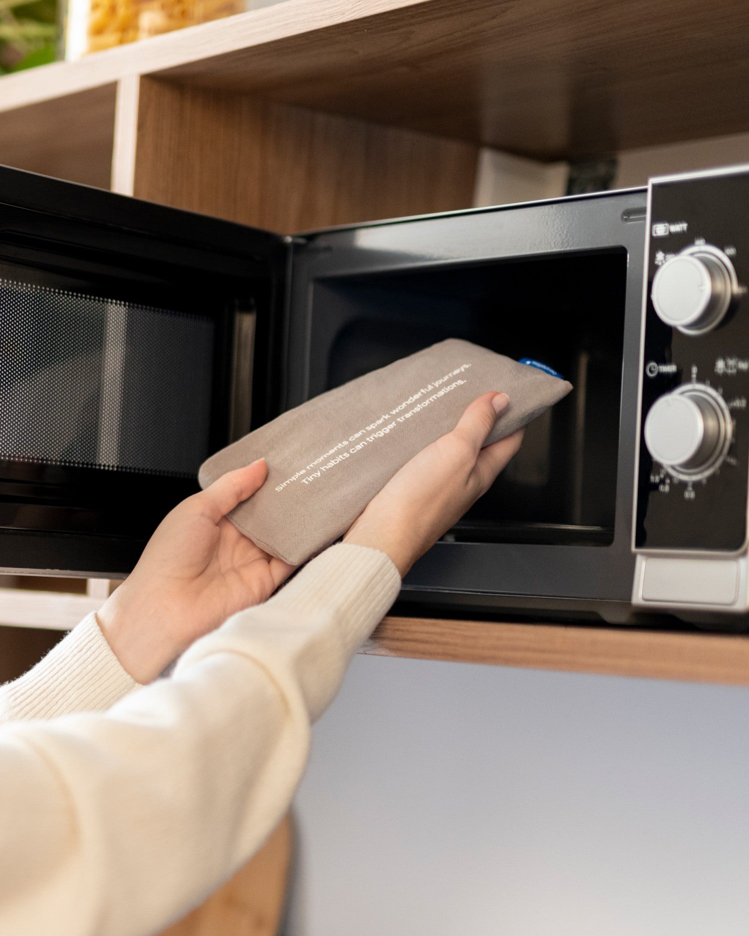 Insert Hot & Cold Eye Mask into its protective cotton bag, place it in the microwave, and heat it to max power (1000W) for 30 seconds. Make sure that any other microwave functions are turned off.